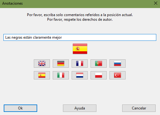 Las valoraciones de Let's Check provienen exclusivamente de programas de ajedrez. A cualquier posición del LiveBook puede vincularse un comentario en cualquier idioma, con una longitud máxima de 139 caracteres.
