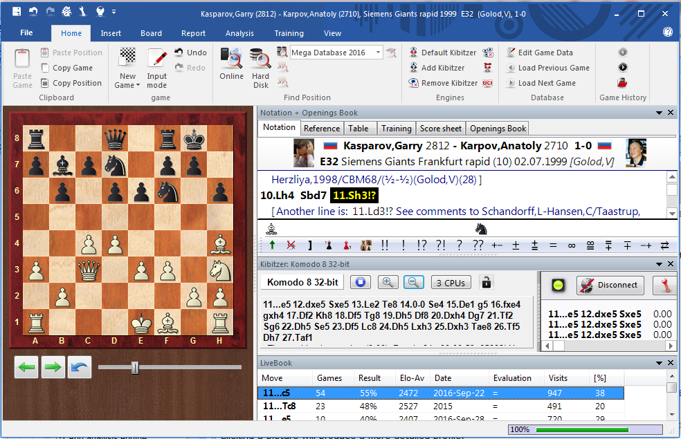 A special book window allows you to compare the moves in the notation window and the openings book.