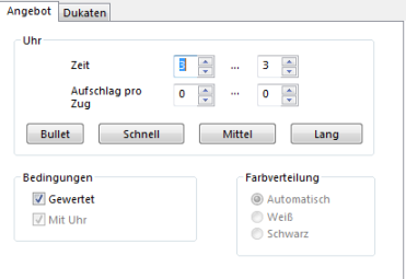 Wenn Sie einen Gegner herausfordern, können Sie in dem Dialog Angebot Bedenkzeit und Typ der Partie festlegen: