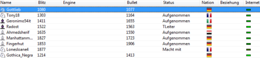 Tipp: Es kommt gelegentlich vor, dass der Server den Spielerstatus nicht korrekt anzeigt. So ist z. B. ein Spieler längst ins Turnier aufgenommen, obwohl noch der vorige Status ,,Macht mit" ausgegeben wird. Dies kann dazu führen, dass dieser Spieler gleich mehrfach eine Anmeldung an den TLeiter abschickt. Hier hilft nur der Hinweis an den Spieler per Chat, dass er schon registriert ist.