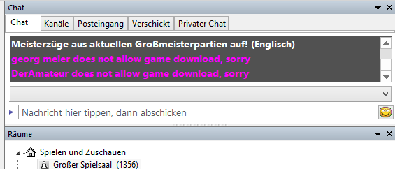 Beachten Sie, dass viele Spieler den Download/Anzeige ihrer Partien gesperrt haben. Diese Information wird im Klartext im Chatfenster angezeigt.