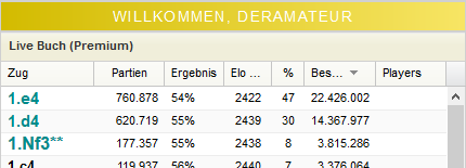 Pour l’entraînement aux ouvertures les contenus du Live Book sont affichés. Le Live Book est l’immense base d’ouverture hébergée sur notre serveur. Au moyen des marques en couleur on peut reconnaître de suite quels sont les coups faisant partie du répertoire.