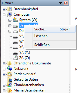 Tipp: es wird in der Praxis häufig vorkommen, daß Sie Datenbanken in unterschiedlichen Verzeichnissen auf einem Laufwerk gespeichert haben. Klicken Sie einmal mit der rechten Maustaste auf ein Laufwerkssymbol und aktivieren die Funktion Suche.